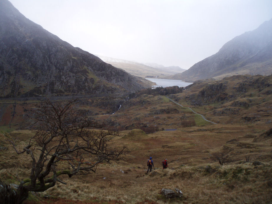 The rest of us parked at Ogwen Cottage (this was Plan D, or possibly E, maybe?) and took the path past Llyn Idwel up to the Devil’s Kitchen – a route which Alan has done “about 95 times”, so we let him go first. The path was quite icy underfoot in places, and as we gained height that turned to snow. We then headed north-west up Y Garn; when we reached the summit the sun made a brief appearance and gave us some impressive views across to Tryfan and Snowdon. Unfortunately the good weather was short-lived: as we reached the top of Foel Goch the snow started to threaten. Some debate then ensued as to the best way down: Dave, Bob and Bruce decided on the route less travelled from Foel Goch, which was apparently “interesting” in places but got them back to the car park a good hour before the rest of us. The remaining group went for the more defined path on the map, which meant heading halfway back up the north side of Y Garn again, this time with the accompaniment of stinging snow showers and a distinctly stiff breeze. The downwards route was a new departure for Alan, and more of a clamber to begin with, often requiring five points of contact (waterproof trousers make a very handy sledge on packed snow…). Once out of the wind and past the most difficult part, we had a late lunch stop, at which point Rhoda realised that Bob was carrying all her food. Fortunately Keyna always packs enough sandwiches to feed a small army and there were also chocolate rations on offer. The path eventually took us around the other side of Llyn Idwel and back to the car park to meet the others.