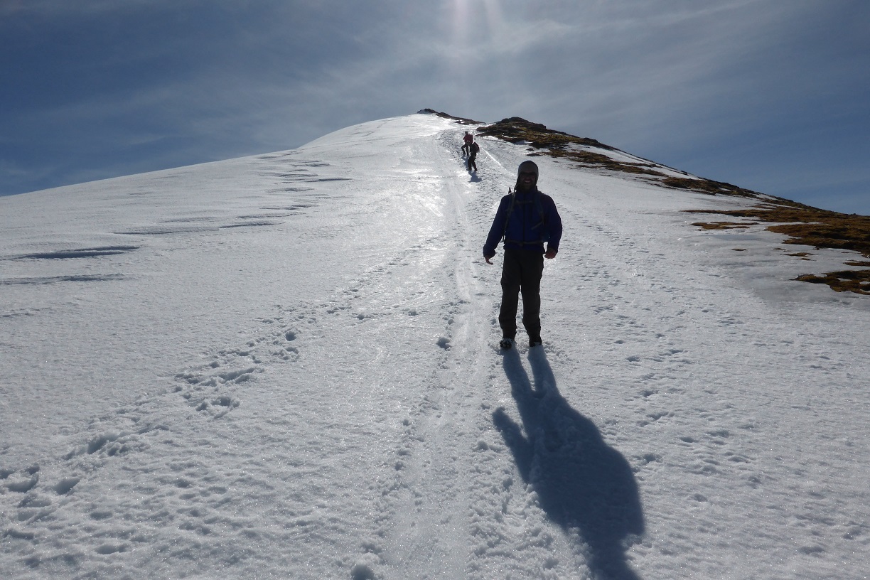 - Dan’s fearless crampon descent off An Stuc to applauding onlookers. I discovered a few days later, turn right at the top, and there’s an easy way down.