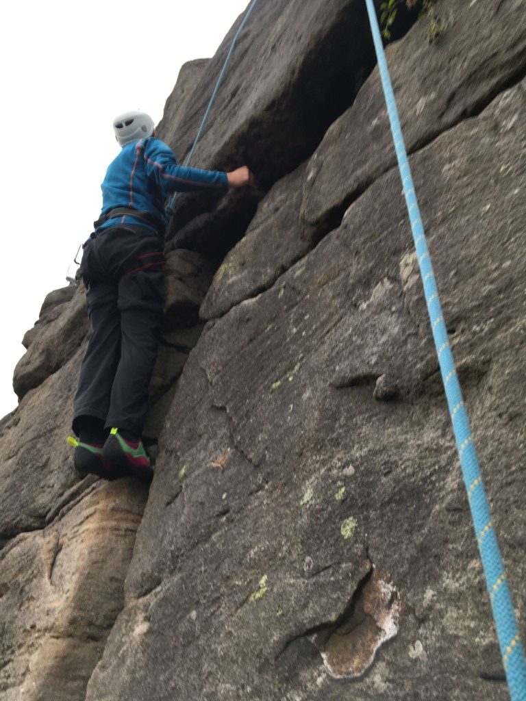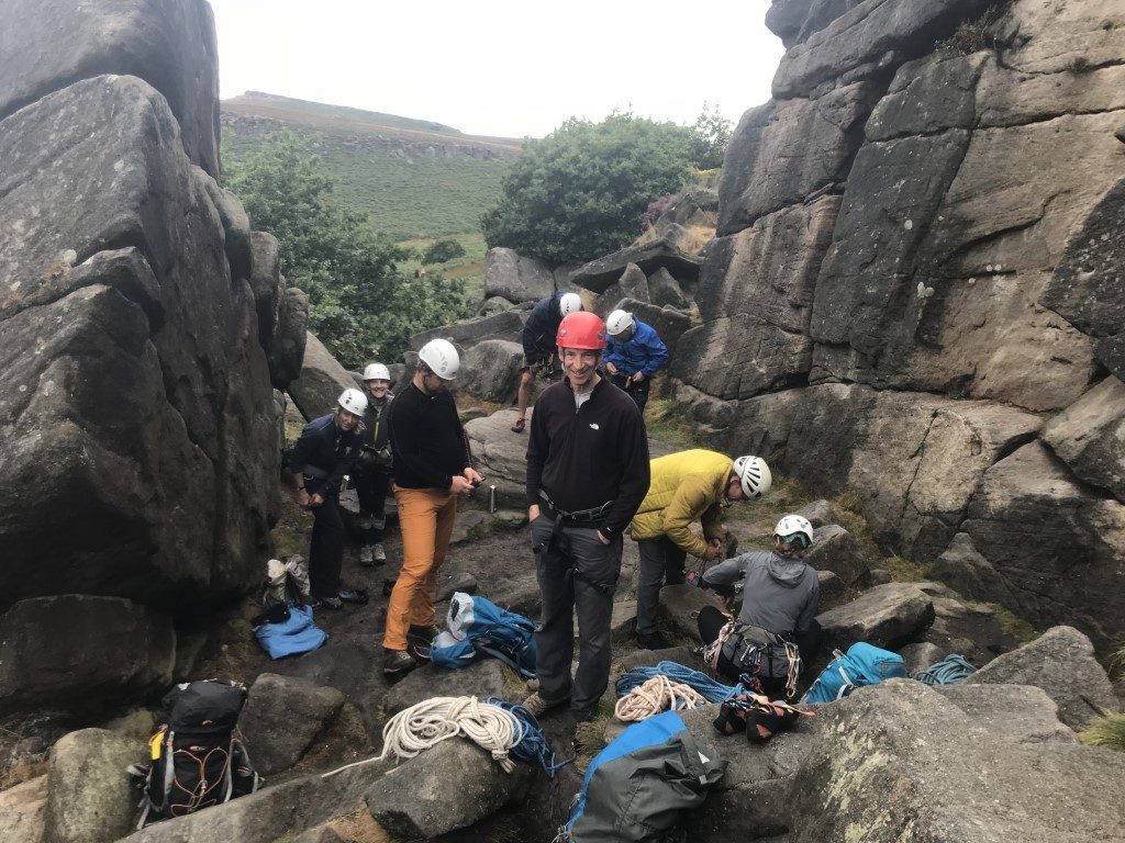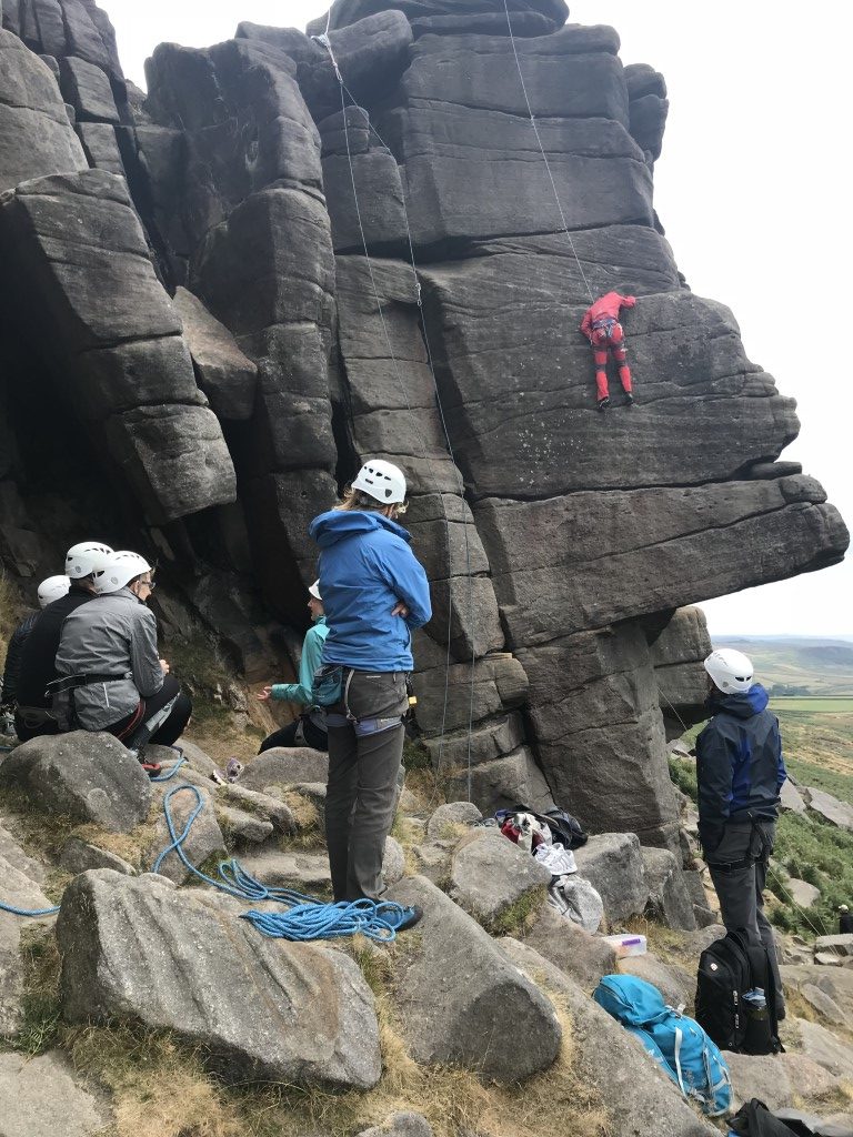 We stayed in Hope Valley (a mix of Pub or camping) and on Saturday morning made our way over to Stange Edge which is a mecca for climbers in the area. It wasn’t quite as busy as expected possibly due to the holiday season so Danny raced up the crags to setup the ropes and soon we were under way. We started learning the harnesses and how to tie in safely followed by the basics of belaying. Then we started climbing up the crags and putting our theory into practise. The sun was shining and everyone was having a great time and we were all starting to climb higher up and over more difficult routes.