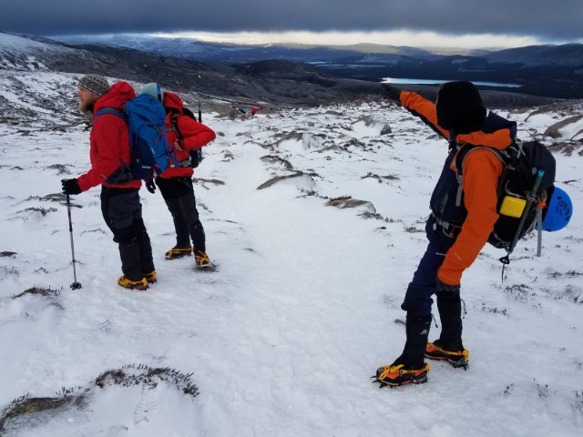 Once everyone arrived and we could get out on the hills we were able to do some basic winter understanding. Learning about avalanche risk, reading the avalanche forecast and interpreting that onto the map. Also discussing other factors such as route planning factoring in the wind and snow drift it causes. Then it was how to properly use our crampons and ice axe equipment. How to move across different terrain in the crampons – side steps, toe-ing up steep slopes and properly moving down them. Then cutting steps and different techniques.