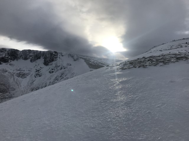We finished the course by moving onto practising ice axe arrests. This was a little harder trying to find some suitable areas to practise. Partially because good snow that had not been touched was still hard to come by, and also quite a lot had started to turn to ice in the freeze-thaw conditions. However Isaac found an untouched area of snow with strategically placed “safety heather” that would catch us if required. We practised basic technique before trying move adventurous moves such as head first, on your front, back and then finally backwards head first!