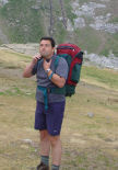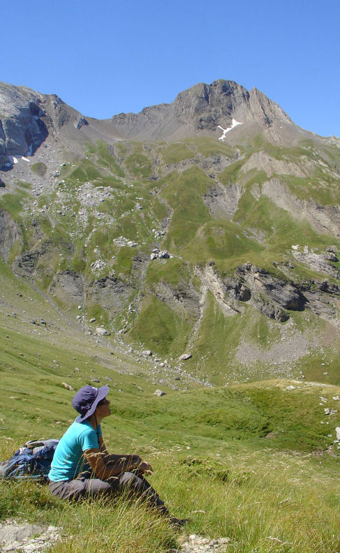 What I had not forgotten was the onward route. Whilst the majority of walkers and backpackers descend all the way to Gavarnie, George Veron in his guide to the HRP (the route we were following for this leg of the week) had devised a much more direct route. Veteran mountaineers will know that when directness is involved in the hills it will also involve some bloody hard work. We rounded a bluff and the bloody hard work was laid out before us. We stopped at a locked shepherd's hut (Cabane De Sausse, 1900m) and had a breather. My boots were beginning to be torture. Simon asked if I was limping. I slackened off the laces and opened out the tongue. I remembered clearly that the climb was a chore and that this had been when I was a fit stripling. I kept this information to myself and we set off. The climb is pathless and over thick grass. It is important to arrive on the ridge above at the right point, to avoid some steep walls. But as Louis Armstrong once said, "we have all the time in the world", so halfway up we stopped on a grassy bluff and I offered to make some soup. Andrea spotted that the best before was May 2000 on my gemusesuppe and refused to have any, so we had to have the 2003 knoblauchesuppe instead. It was good, filled the spot and gave us the energy to finish the rest of the climb quickly. Andrea showing Simon and I up by arriving at the top first (Pic De Sant Andre, 2608m). The view was very good, but unfortunately showed us that there was still a way to go. The ridge was cold and undulating. We made a steep downhill (Col de Espécières, 2334m), ate a little more and plodded on back up almost as high as we'd just been (Pic Les Ports, 2476m) before dropping again to the Port De Bucharo (2270m). Simon learnt the hard way that contouring around does not always work out as one had hoped.