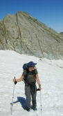 The sun was up bright and we were off by 8am, the superb view of the North face of the Vignemale dominating the vista from the hut. There are many fine climbs to the top, but we had plans of a more circuitous nature, like the early pioneers "the weak in courage is strong in cunning". The shape of the land kept the mountainside in shadow and we made good time. We spotted a group who were strong in courage climbing the face. After a short climb we were at the Horquette D'Ossoue (2734m). Our next hut was only a kilometre away. We dropped to it and after a Coke or two deposited as much gear as possible before heading out to conquer the Vignemale. This involves a slight drop, a traverse over some very steep bare rock and a long glacial plod. The total declivity is about 750m. It was late for starting such a climb and most of the day's ascensionists were on the return journey. But it was fun and our packs were light. My boots were giving me a little pain, but by loosening the laces it wasn't too bad.