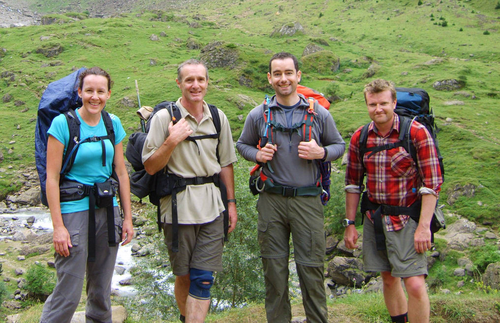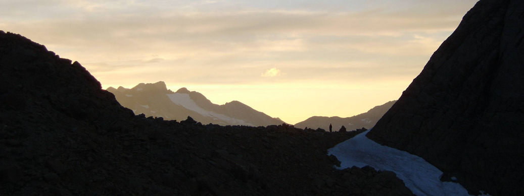 The Bucharo col has a road up to the top on the French side, an unfinished Franco-Spanish project from the 1930s to connect the countries. Because of this there are a fair few day walkers. I took my boots off and cleared the area. There was only a few km left and one last climb. We drank bucketfuls of water from a stream, and against the tide of day walkers coming down we slowly worked our way up, scrambling up where the path followed the bed of an icy torrent. But at last we were in the snowy final col. The hut was before us. With a newfound energy we covered the last metres and gladly dropped our sacks. Richard and Bruce were already having dinner so Andrea, Simon and I waited outside as the sun warmed the rocks with the last rays drinking a well earned beer or two. I threw my socks away as the pong was too much, even for France. It was, without doubt, the hardest day I have ever been on with the NMC. We did 1358m of ascent and covered some 18 km all under the glaring, unrelenting summer sun. No major peaks – but then as Robert Pirsig once said - "To live for some future goal is shallow – It is the sides of the mountain that sustain life, not the top". We ate our dinner in the second sitting and then all sat and watched the sunset over the Cirque de Gavarnie whilst drinking some dubious French red plonk.