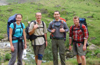 Towards the top we got a mobile signal. This bought the news that 'The Jackal' (we had exhausted every possible joke about international terrorism, body cavity searches, etc etc) had caught the same flight as Bruce and Richard and was going to try and catch Andrea and me up. This was unfortunate as I had told the Guardian of the hut we would be staying at that night that we'd require a room for two. If there is one thing hut keepers don't like it is uncertainty.