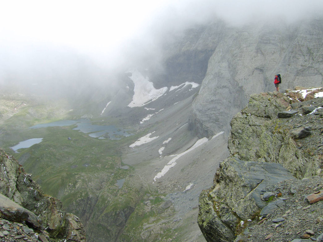 It had snowed on the tops in the night. We paid our rather large bill (oh, those liqueurs were nice though) and set off in the cold. The first part of the day was up to the roadhead along the tarmac. The cloud was grey and it was getting colder. The head of the Troumouse valley is a great bowl of undulating pasture, dotted with small lakes. Supposedly a pleasant place in summer. To reach the start of our climb meant a long traverse to the opposite side of the bowl, and from there a careful bit of route finding to ensure the correct line was taken to the top and the Col de la Sede. To miss the col would have been quite dangerous. But we had Monsieur's post-its and my previous knowledge of the route so we couldn't fail. The cloud broke enough to be able to see the col and the post-it maps were uncannily accurate. The climb to the col, when seen from below and afar, looks impossible. The angle of the rock, for it is rock over which the way lies, looks too steep. But up close the rock is seen to be in steep short terraces, making upwards and onwards progress a delight. Like the steps to Alamūt, to الموت and the Assassins guarded by a single bowman (well, I thought it was anyway). At the top the way opened out and we found ourselves on a broad ridge. We followed this up further, with mist swirling around below us obscruing the precipitous face of the west flank of the Pic de Gerbats. Many years ago I had looked over this edge and seen on a wafer thin terrace path an old man happily walking along. But not today.
