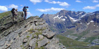 We headed off at 8:30 with the prospect of warm showers at the end of the day. The first part of the day was a walk up to the Horquette d'Alans which we'd almost got to a few days earlier. It was colder and overcast which kept the pace brisk. From the col there is a long downhill following the Estaubé valley. But I decided that as it was a short day and the previous two had not been taxing, the group should have a go at visiting the tiny Refuge de Tuquerouye which is nestled in the col of the same name. On my last visit it had been a tiny, damp, cold, dark and somewhat unpleasant hovel. Getting to it involved a steep climb. Bruce, Simon, Andrea, Dave and I set off. Bruce turned back, Simon went off on a tangent. We followed the faint path and over a boulder field, old snow filling the gaps in the boulders. Simon popped out from behind a boulder ridge some distance away. Now, the best idea for joining us was to lose a little height and cross over to us on the rock, but intrepid Simon decided on the direct approach, even if it was across the top of a 60' 45° ice and snow slope. Boldly and then more cautiously, Simon made his way forward. Andrea, Dave and I watched with growing horror. However, Simon returned to the safety of the rock, but armed himself with two fangs of rock and stepped again onto the snow. Great Boldness is Seldom Without Some Absurdity and how right Bacon was. Still expecting a death slide to oblivion we watched again in horror as slip followed slide. The rocks did their thing – at least Simon was able to retreat in safety and take the safe way over to us. Non Semper Temeritas Est Felix, the motto of the hour.